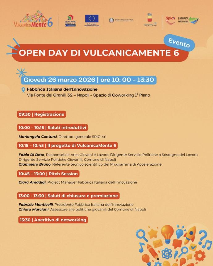 Giovedì 26 marzo 2026, presso la Fabbrica Italiana dell’Innovazione di Napoli, si terrà l’Open Day di VulcanicaMente 6, uno dei momenti centrali del percorso promosso per valorizzare il talento giovanile e accompagnare la nascita di nuove iniziative imprenditoriali, pronte ad accedere al Percorso di Validazione di VulcanicaMente 6.