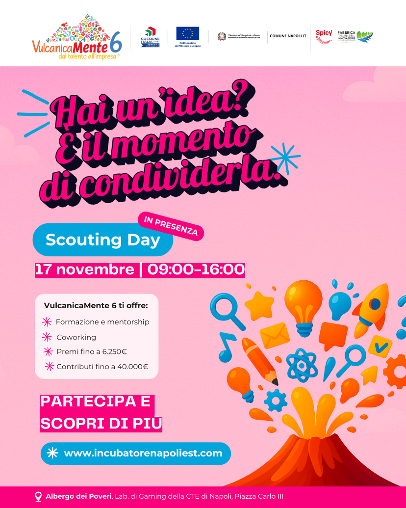 Partecipa allo Scouting Day e vieni a incontrare il team di VulcanicaMente 6 al nostro stand: scopri come entrare nella competition del Comune di Napoli che aiuta giovani talenti e team creativi a trasformare le idee più brillanti in startup innovative.