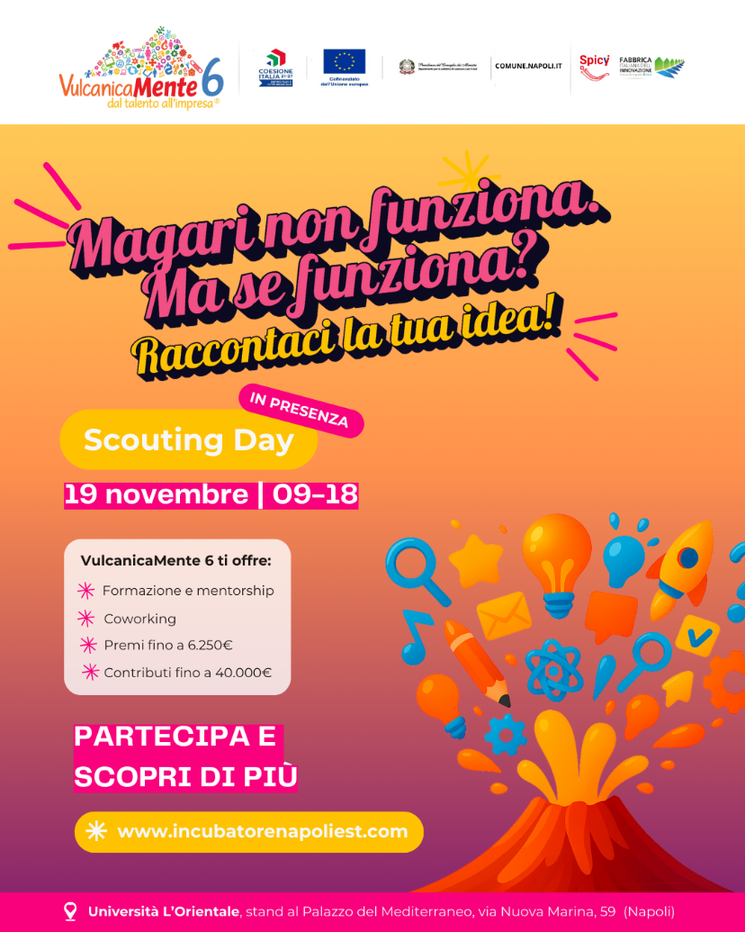 Partecipa allo Scouting Day e vieni a incontrare il team di VulcanicaMente 6 al nostro stand: scopri come entrare nella competition del Comune di Napoli che aiuta giovani talenti e team creativi a trasformare le idee più brillanti in startup innovative